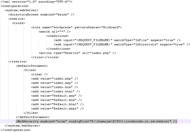<ModSecurity enabled="true" configFile="<FULL PATH>\disabled_rules.conf" />