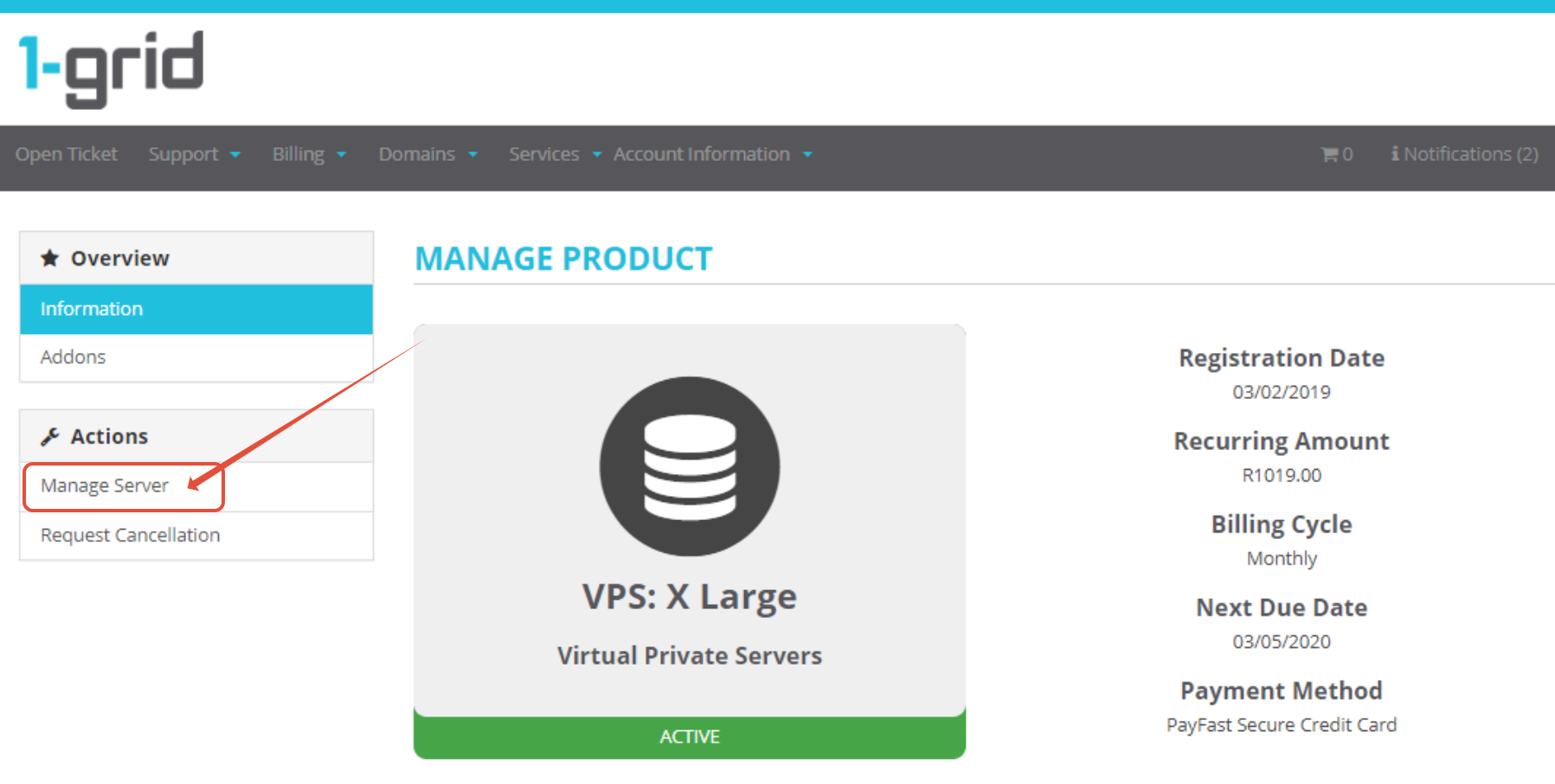 Step 4 - Click Manage Server under Actions