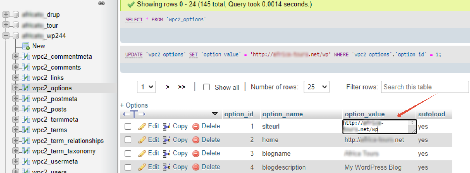 Step 7. Once clicking on options remove the wp from the option_value tab by double clicking on the tab and removing it