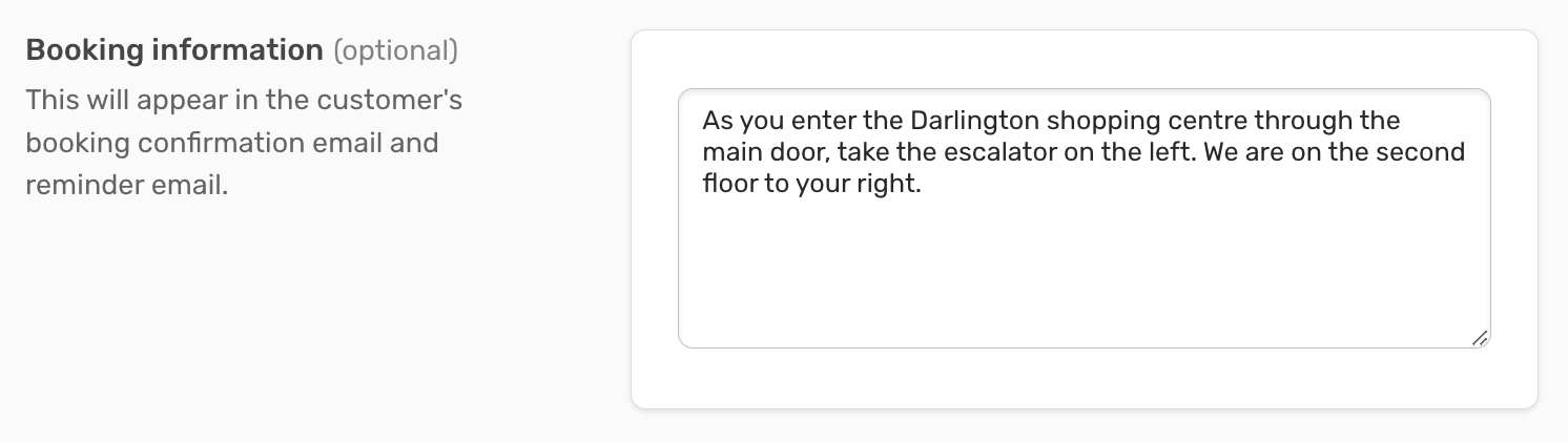 - Other. This will be shown to your customers during checkout and it will be included in the confirmation email for their booking.